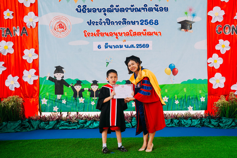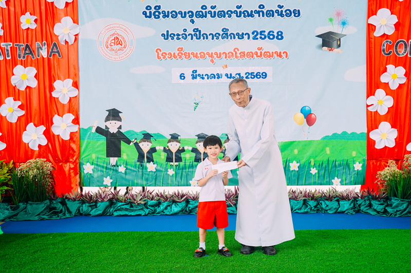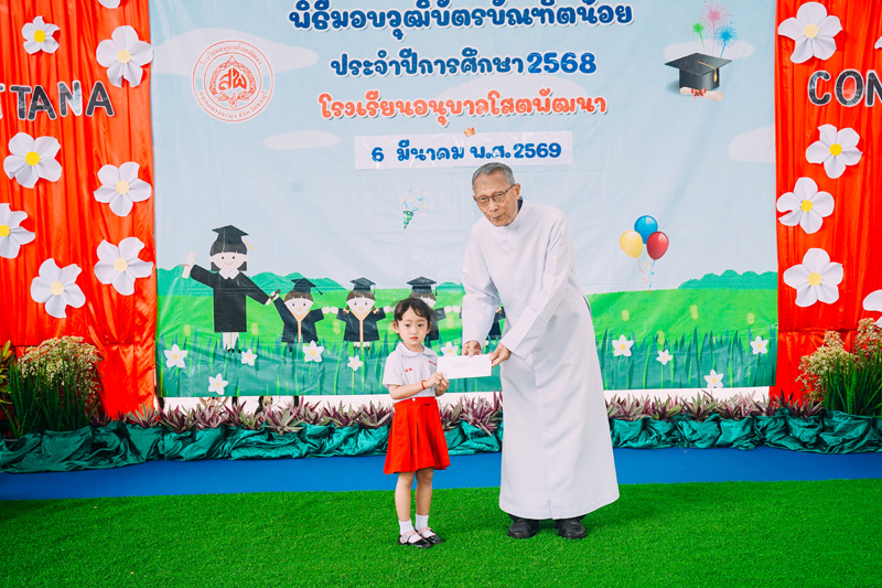 วันศุกร์ที่ 6 มีนาคม 2569 นางอังคณา กำเหนิดโทน ผู้อำนวยการโรงเรียนอนุบาลโสตพัฒนา ได้มอบประกาศนียบัตรแก่นักเรียนชั้นอนุบาล 3 ที่สำเร็จการศึกษาระดับปฐมวัยในปีการศึกษา 2568 จำนวน 7 คน ซึ่งเป็นนักเรียนที่มีความบกพร่องทางการได้ยินจำนวน 1 คน ออทิสติก 2  คน และมีความบกพร่องทางสติปัญญา 4 คน ได้แก่ 1. ด.ญ. จิรภิญญา แก้วตะพาน  2. ด.ญ. ณัฏฐณิชา ผลประดับ 3. ด.ช. อามานี่ ไชย์ยาน  แก้วเกิดมี 4. ด.ญ. อิสยาห์พร ธนากิจเจริญไพศาล 5. ด.ช. จิรภาส ธัญถาวรวาณิช  6. ด.ช. ภูวษิ นาทัน  และ 7 . ด.ช. ธนกฤต กำแพงหล่อ โดยนักเรียนที่สำเร็จการศึกษา เป็นสมาชิกห้องดอกไม้ อนุบาล 3/1 และห้องนกฟีนิกซ์ อนุบาล 3/2.. ส่วนนักเรียนที่ได้รับเกียรติบัตรเด็กเรียนดีประจำปีการศึกษานี้ ได้แก่ 1. ด.ญ. เพ็ญภัสสร สุมหิรัญ 2. ด.ช. พุทธิชาต แซ่โค้ว  3. ด.ช. ธีร์ธนสาน เศรษฐปราโมทย์  4. ด.ช. จิรภาส ธัญถาวรวาณิช  5. ด.ช. ภูวษิ นาทัน และ 6. ด.ญ. ศศิวริญป์กานต์ มั่นกลาง จากห้องกุ๊กไก่ ห้องใต้ท้องทะเล ห้อง Ladybug ห้องนกฟินิกซ์ ห้องดอกไม้ และห้องต้นไม้ ตามลำดับ โดยคุณแบร์นารด์ มุลเลอร์ ได้มอบเกียรติบัตรให้กับนักเรียนทั้ง 6 คน..  ขอแสดงความยินดีกับบรรดานักเรียนและผู้ปกครอง ตลอดจนคุณครู ขอให้ทุกท่านมีกำลังใจในการดูแลเด็ก ๆ ให้เติบโตต่อไปอย่างมีความสุข และส่งเสริมให้น้อง ๆ สามารถพัฒนาตนในทุกด้าน  โอกาสนี้ ขอขอบคุณผู้แทนจากเครือข่ายของโรงเรียน รวมถึงคณะของนางเทพทอง ทองเหลือง หัวหน้าปฐมวัย โรงเรียนประชาสงเคราะห์ อ. พานทอง จ. ชลบุรี และนางสาวนันทินา วังเวง ผู้ช่วยฝ่ายวิชาการศูนย์พัฒนาเด็กเล็กวัดชัยมงคล พัทยาใต้ คุณแบร์นารด์ มุลเลอร์ และคุณซาบีน เชิลเลอร์ ที่ได้มาร่วมกิจกรรม ตลอดจนน้อง ๆ รุ่นอนุบาลของมูลนิธิสงเคราะห์เด็ก พัทยา ที่มาแสดงความยินดีผ่านทางการแสดงของกลุ่มด้วยครับ/ค่ะ