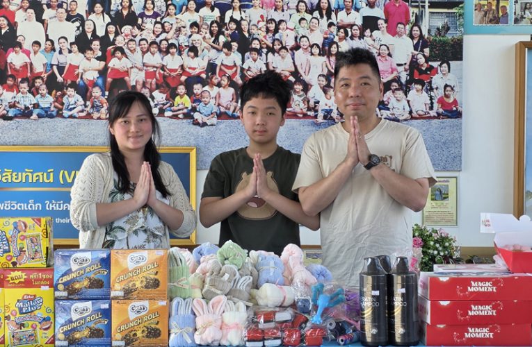 ..The Chung Family of Mr. Wilson, Mrs. Carina, and their 13-year-old son Alston from Hong Kong, for paying their first visit to the Pattaya Orphanage, getting to know our work, and supporting our children as well as disabled persons with various necessities, including donuts.. On this occasion, the family held art activity with the creation of greeting cards for kids in preschool levels and played music with hands for them. In turn, the children danced along music for the guests.. Thanks and best wishes for the New Year 2026 and always..