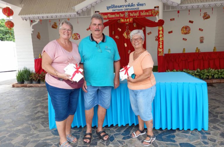 ..Mrs. Monika Schleicher, along with Mr. Ulrich & Mrs. Reinhilde Vincon from Germany, for paying their annual visit to the Pattaya Orphanage during their holiday in Thailand, this time bringing cash donations in support of our daily care for children and disabled persons.. Khun Monika’s contribution came from the sale of her hand-made souvenirs at the Christmas market.. Thanks and best wishes to all concerned..